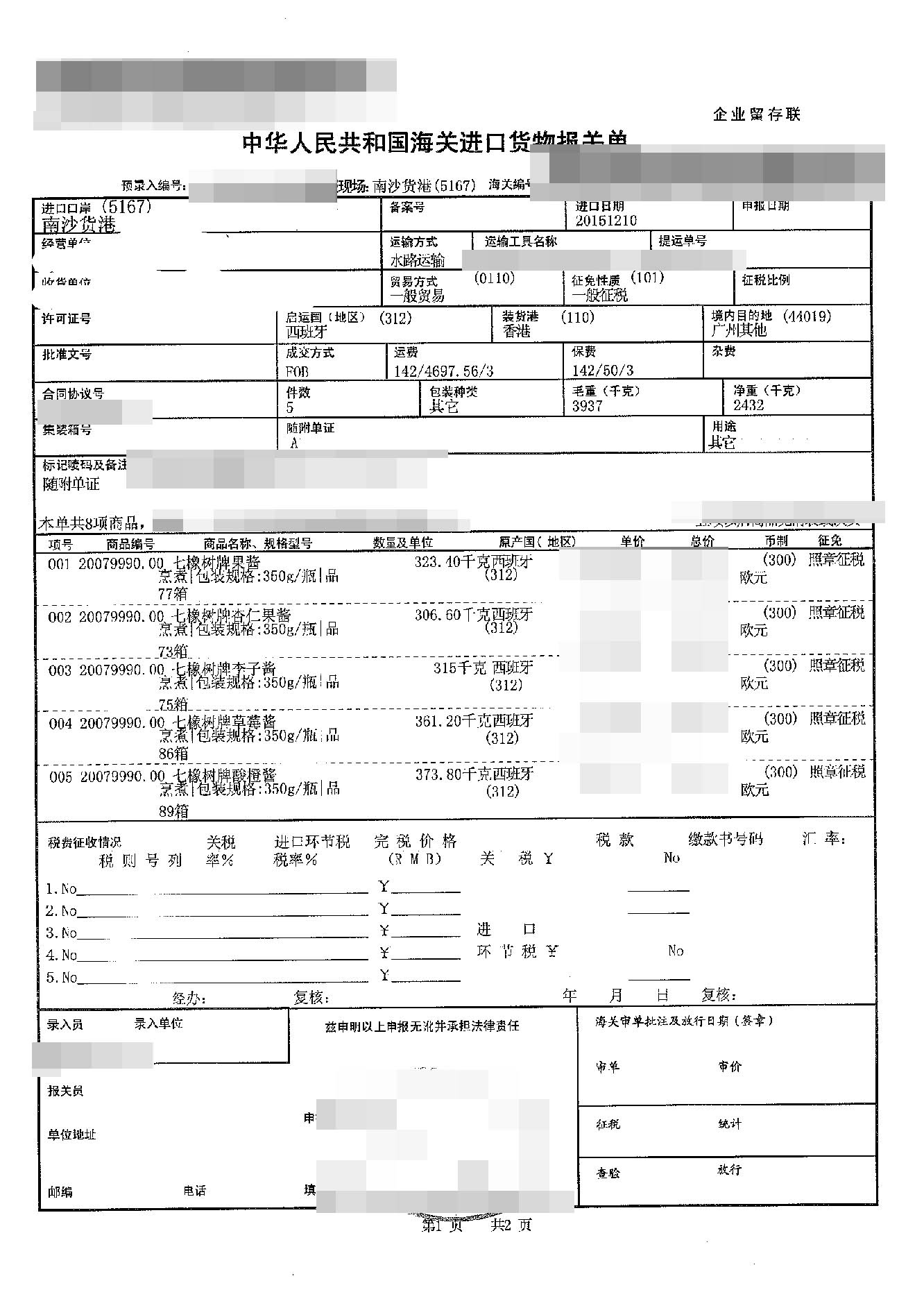 四、果醬進口案例貨物的詳細信息: